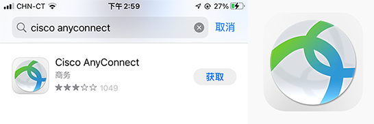 进入苹果App Store,搜索”Anyconnect“,即可下载,或点击这里,直接跳转App store下载