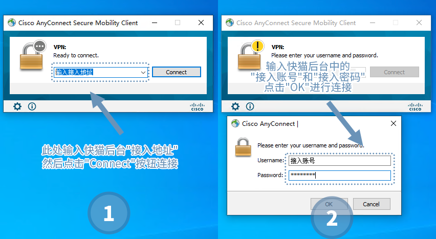 在随后出现的验证输入框中,输入SpeedAI会员后台中的“接入账号“和“接入密码”后,点击“OK”按钮,开始连接。连接完成后,Anyconnect会自动隐藏到右下角状态栏中。