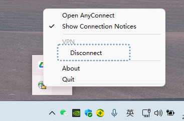 首如需断开,仅需点开Anyconnect界面,点击“Disconnect“按钮即可。或点击任务栏右下角Anyconnect图标,在菜单中点击“Disconnect”即可断开连接